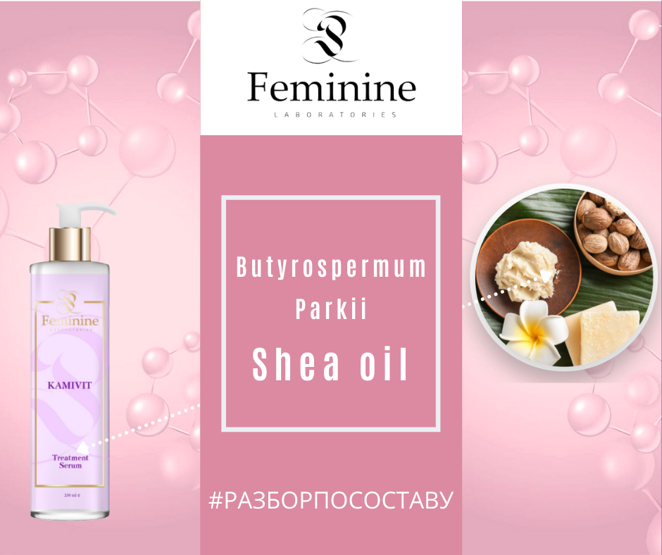 Уникальное масло ши входит в состав успокаивающего серума KAMIVIT от компании Feminine. KAMIVIT оказывает противовоспалительное, антиоксидантное действие, уменьшает раздражение, покраснения, способствует быстрому восстановлению кожного покрова после ран и ожогов ,восстанавливает гидролипидную мантию.
