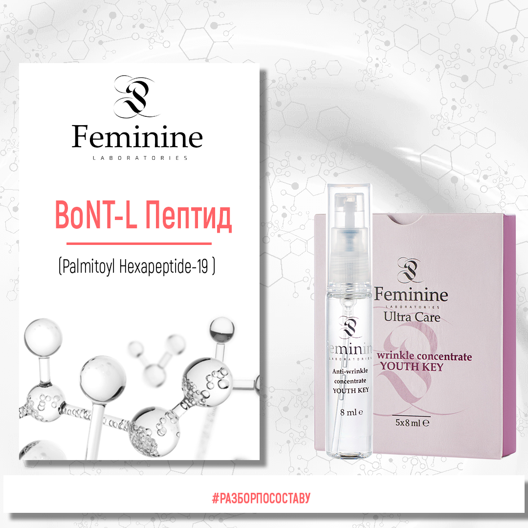 Пептид BoNT-L входит в состав концентрата от морщин YOUTH KEY от компании Feminine. Содержит пептидный комплекс (альтернатива ботоксу). Способствует глубокому лифтингу. В результате достигается видимый антиэйджинг эффект. Имеет пролонгированное действие.